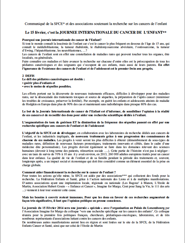 Depuis 7 ans, l'Etoile de Martin a contribué à faire sortir de l'ombre en France cette journée et se félicite que la dynamique se poursuive cette année encore.Voici le communiqué de presse rédigé par la Société Française de lutte contre les cancers et leucémies de l'enfant et de l'adolescent: